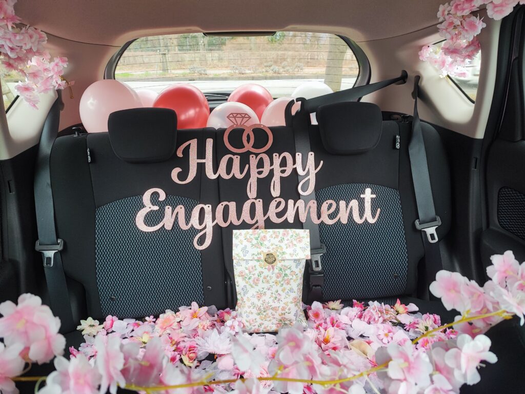 Her fiancé had asked me in advance if I could help create a sakura surprise for her, so I decorated my car and added “Happy Engagement” decorations before the tour.