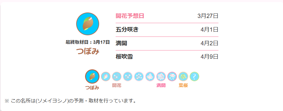 According to the latest data from Weathernews, the blossoms are expected to arrive slightly earlier/later than initially thought at Arakurayama Sengen Park (Chureito Pagoda).